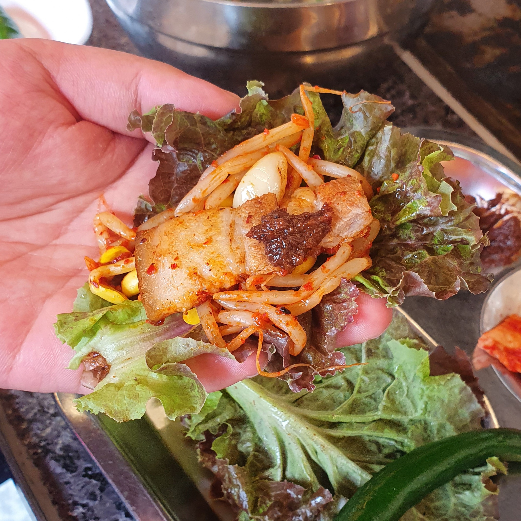 남편이 (자기 먹으려고 싼) 쌈을 찍어보라 한다.