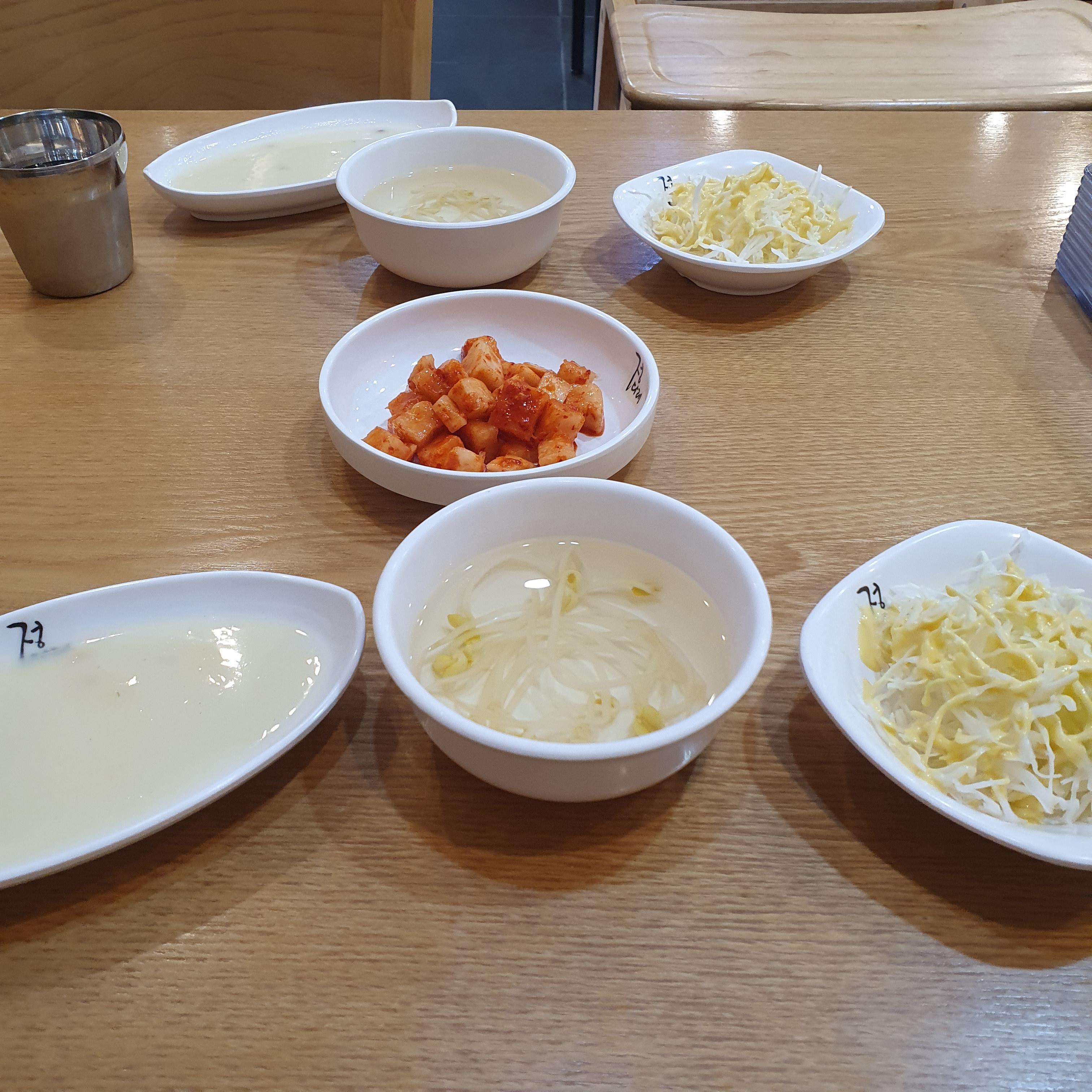 콩나물국, 수프, 깍두기, 양배추샐러드가 차려졌다.